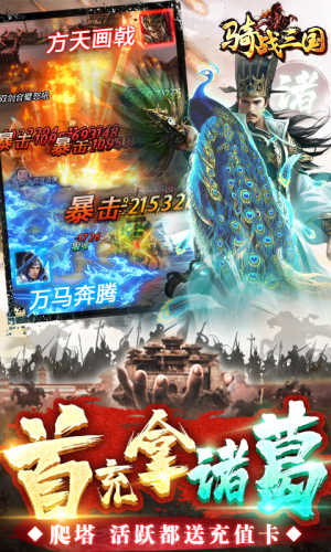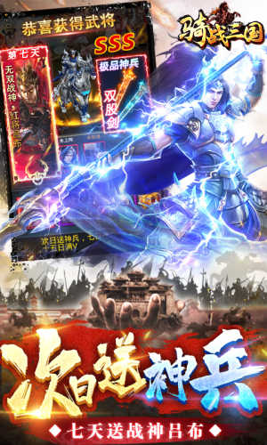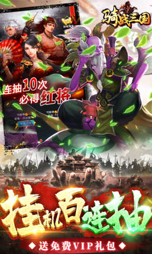 《骑战三国-千充抽神将》是一款三国题材的策略卡牌游戏。游戏中融入武将收集、军团战、名城争夺、草船借箭等玩法, 经典完美传承,三国策略卡牌情怀再续!开局直接30连抽,还有价值888元充值卡,闯关就送白马银枪赵子龙,助主公战吕布,统三国,谁敢与争锋?更有超过上百的三国群英,丰富的武将阵容搭配,数十种合体大招组合,狂拽炫酷,酣畅战斗!更有三国美人齐聚,翘首待与主公合体,貂蝉小姐姐约你来战!一吕二赵三典韦,四关五马六张飞,尽可收归麾下,助主公攻城掠地占名城!